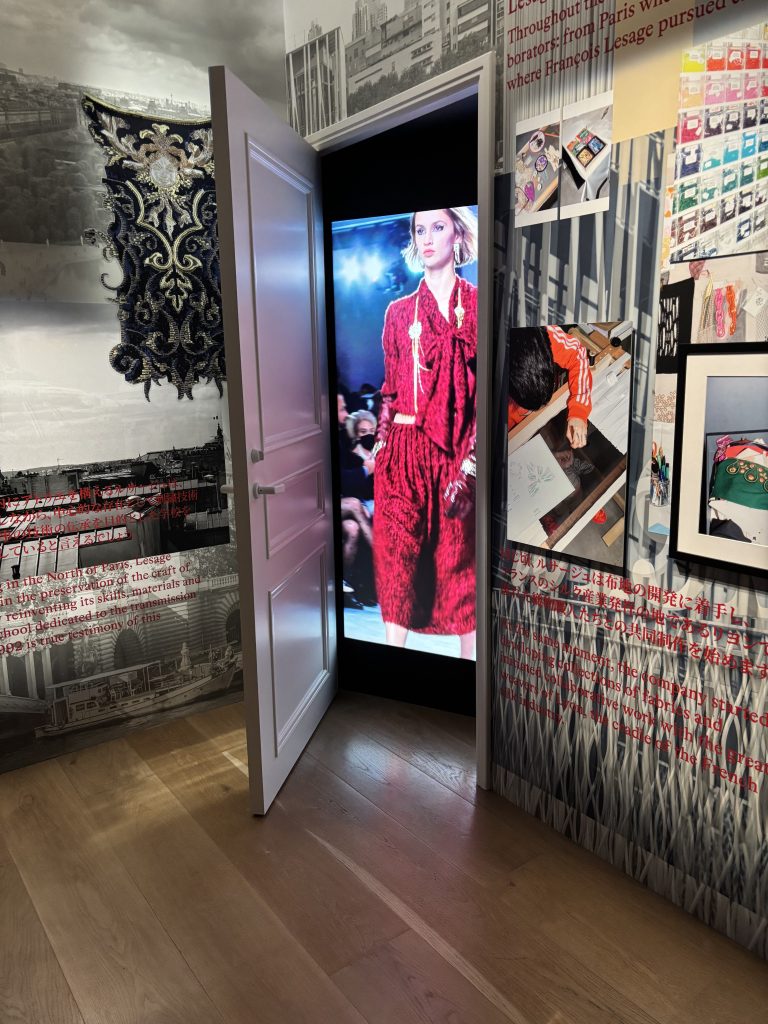 Aici vezi textile care combină tweed-urile franțuzești cu bumbacul japonez, broderii inspirate de peisaje nipone sau piese de mobilier reinterpretate prin tehnici Lesage.